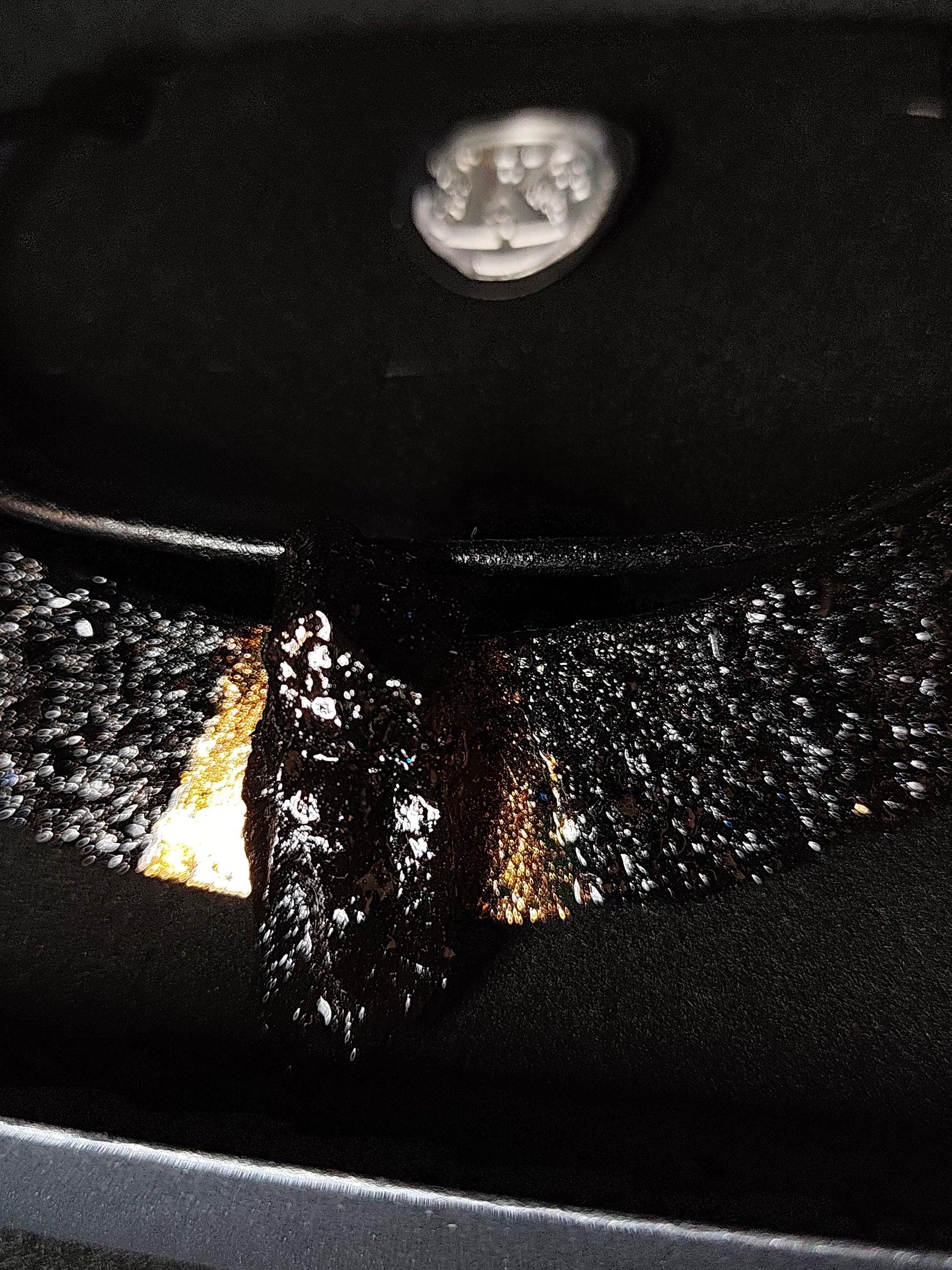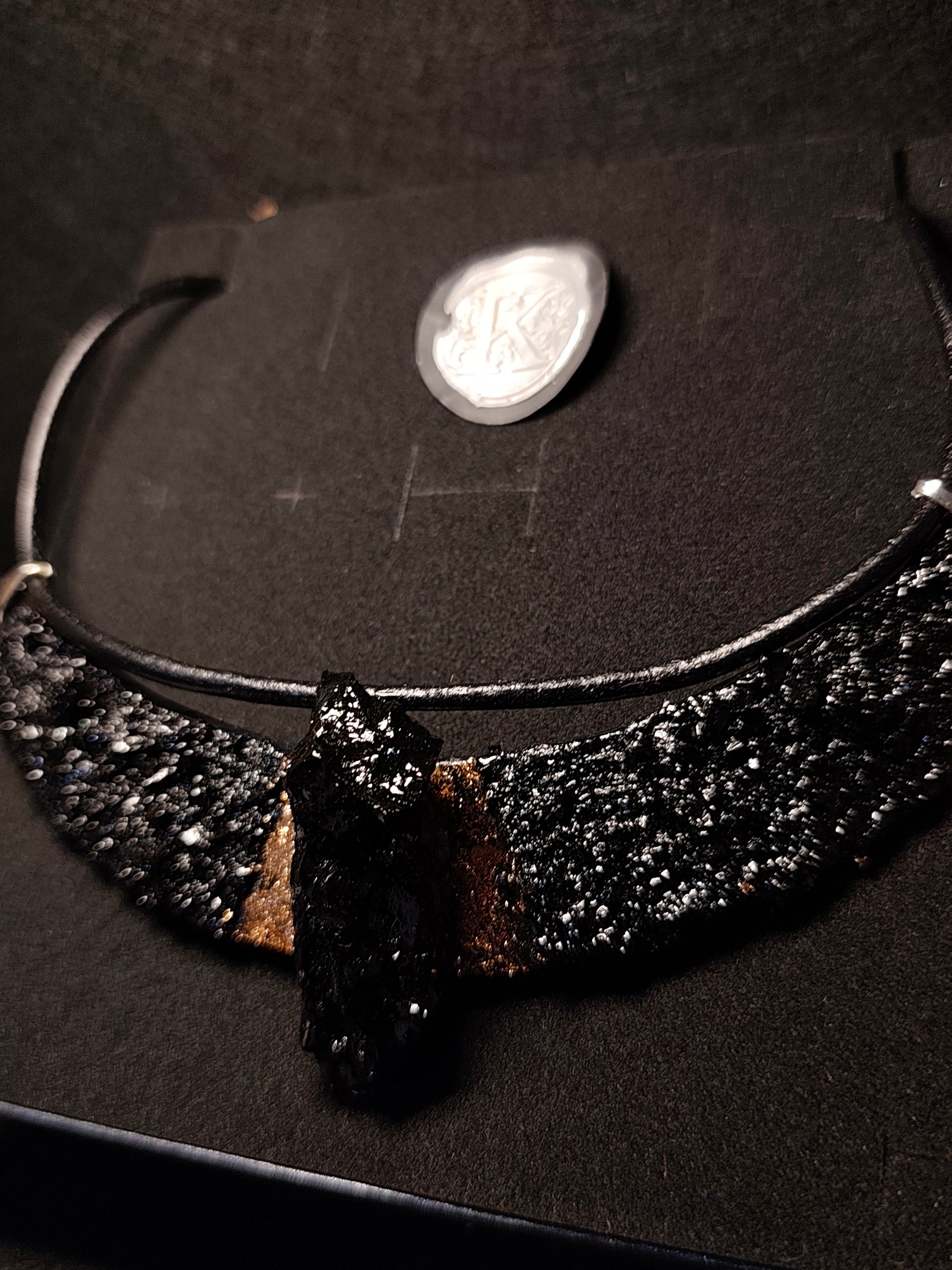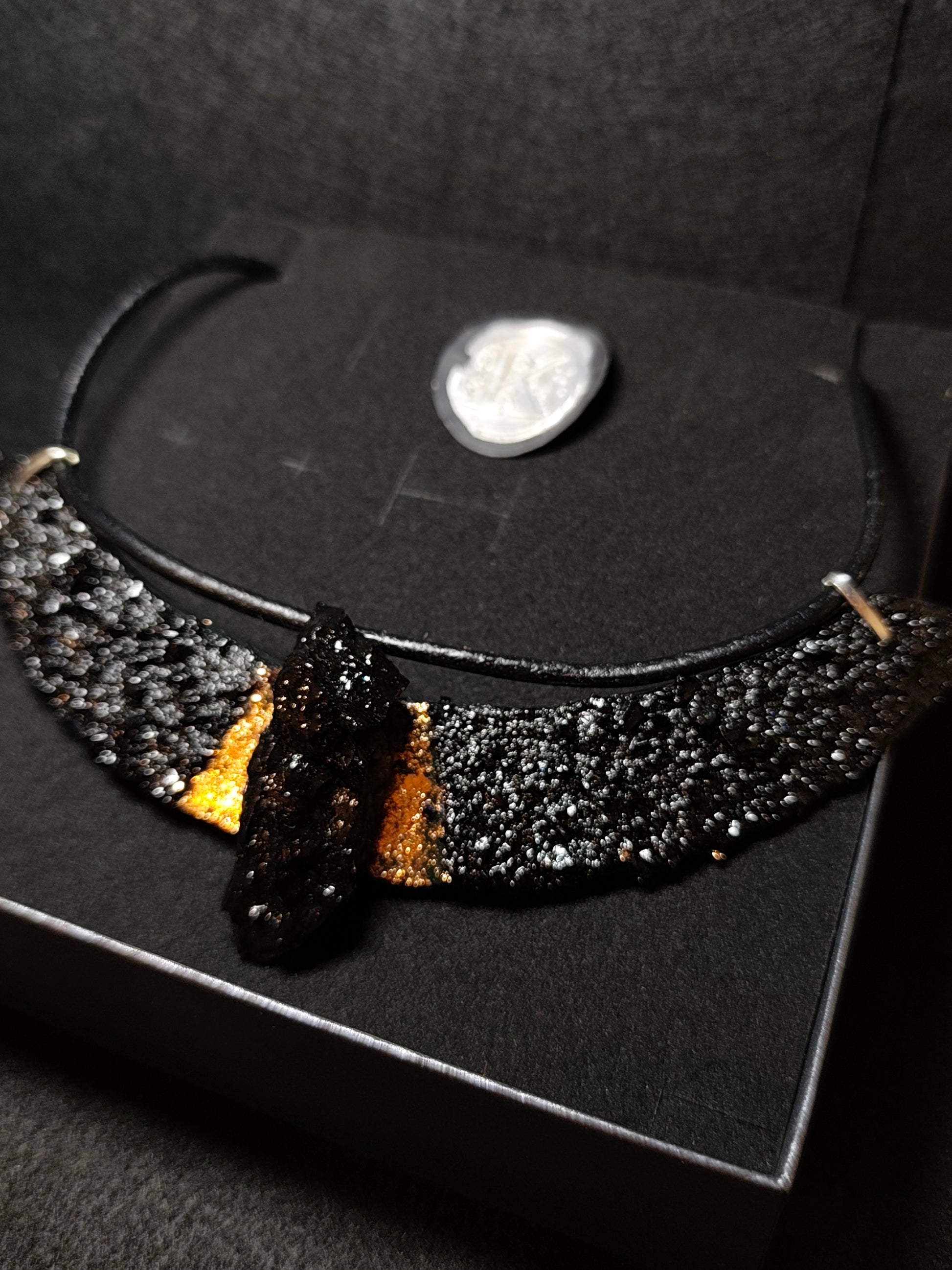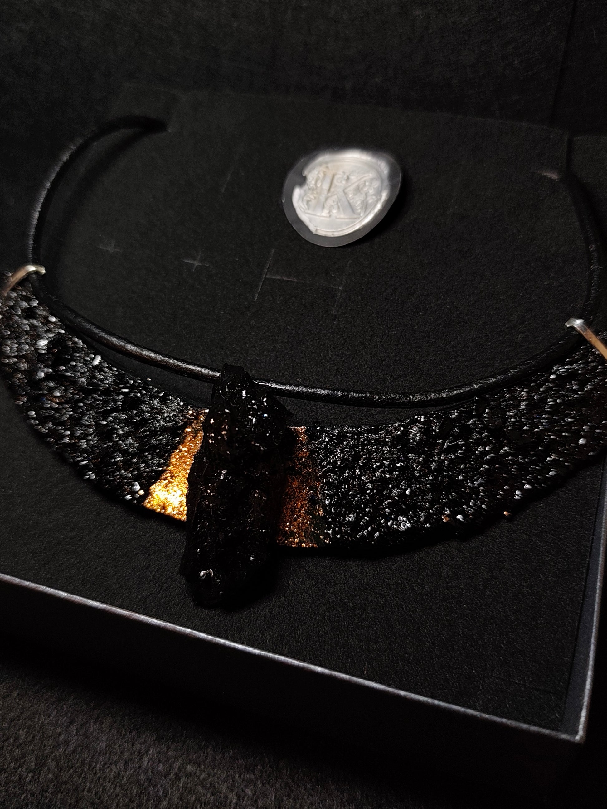 Ogrlica je izdelana z usnjem, ter posebno izbranim kosem premoga. Vsak je edinstven zaradi oblike premoga. Klasicna linija ogrlice Luna, lepo povdari stil s svojim črnim leskom. Primerna tudi za močnejše postave. Verižica doda bakreni lesk zaradi svoje elegantne oblike. Dolzina prilagodljiva.