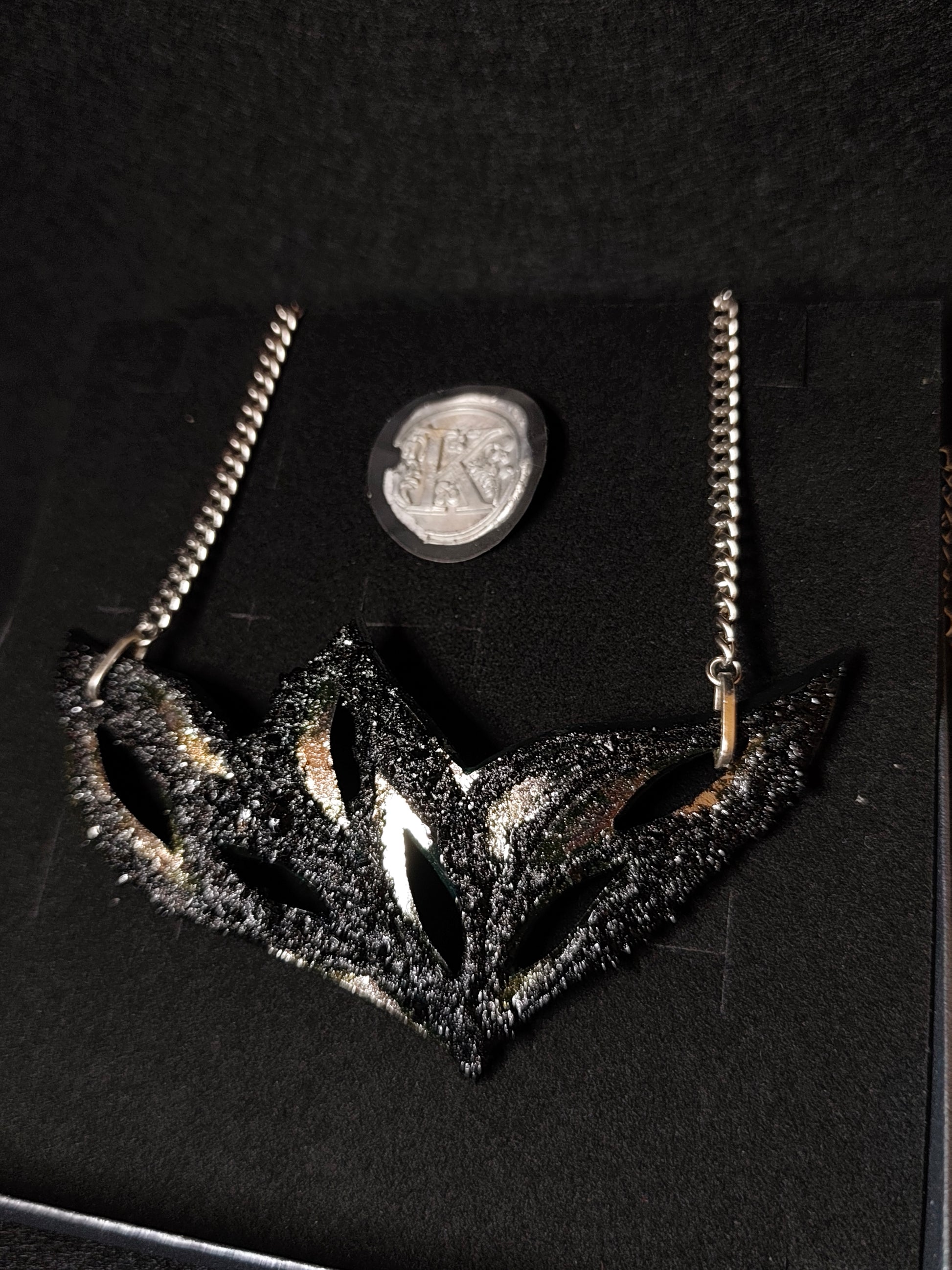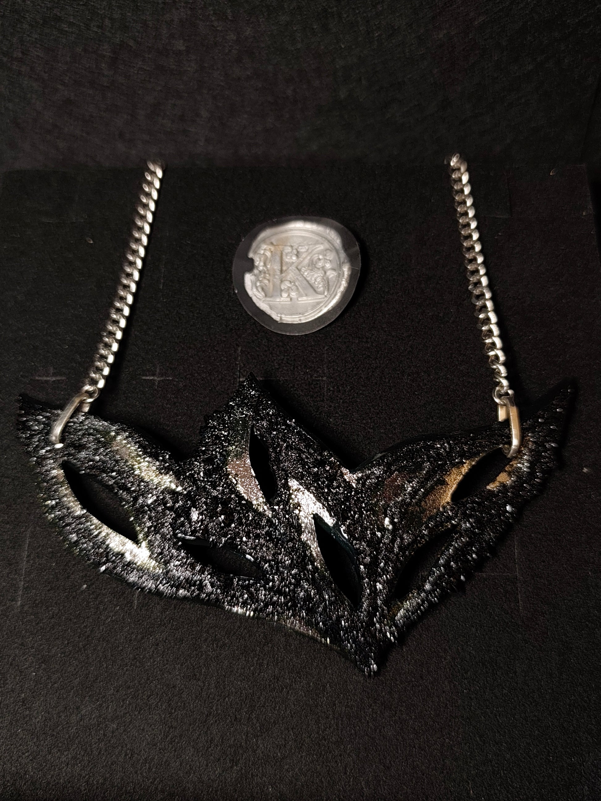 Ogrlica organske oblike, vsaka neponovljiva in ročno izrezana, ki povdari stil s svojim črno - srebrnim izrazom.