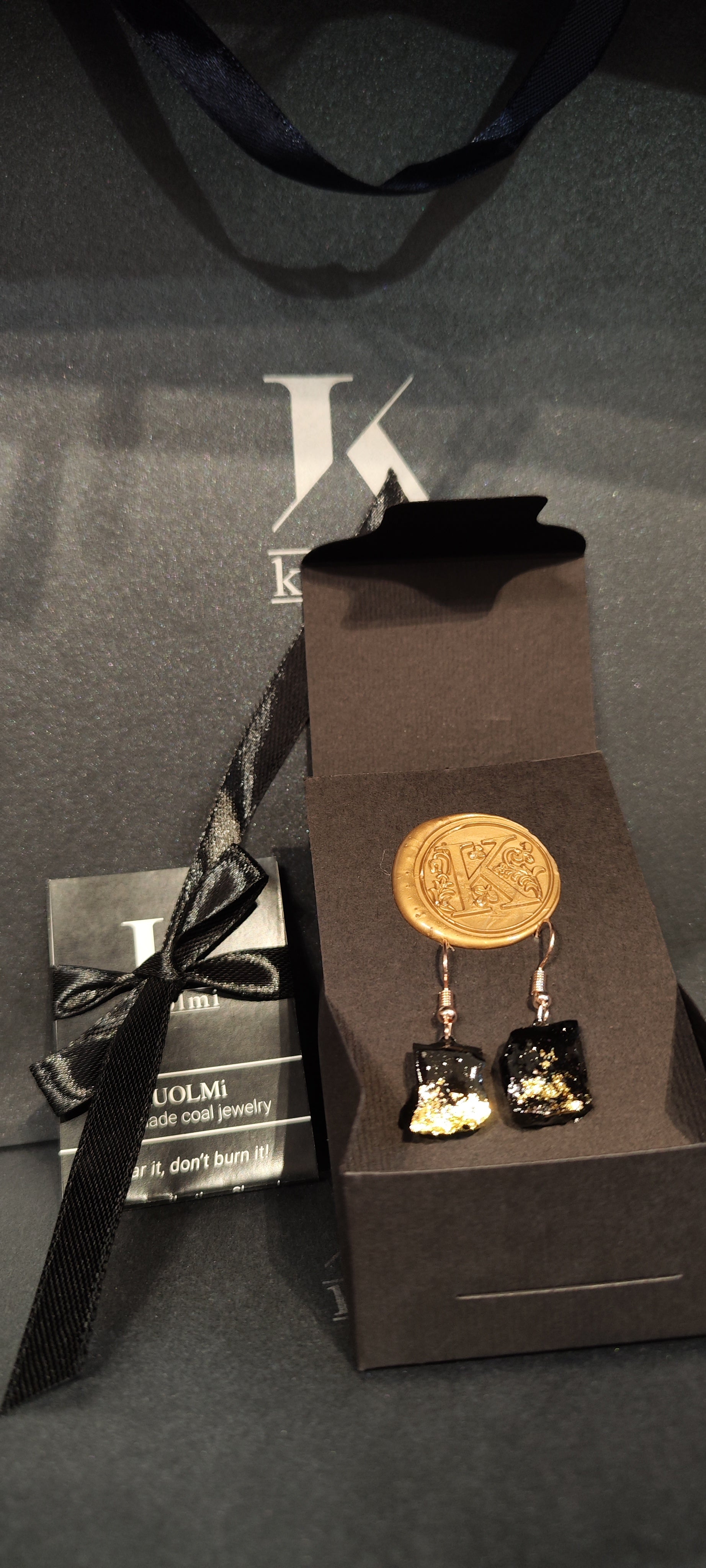 Pakirani v darilni embalaži, na kartoncku z ročno izdelanim pecatom, ter z dodanim opisom zgodbe o premogu iz katerega so izdelani.