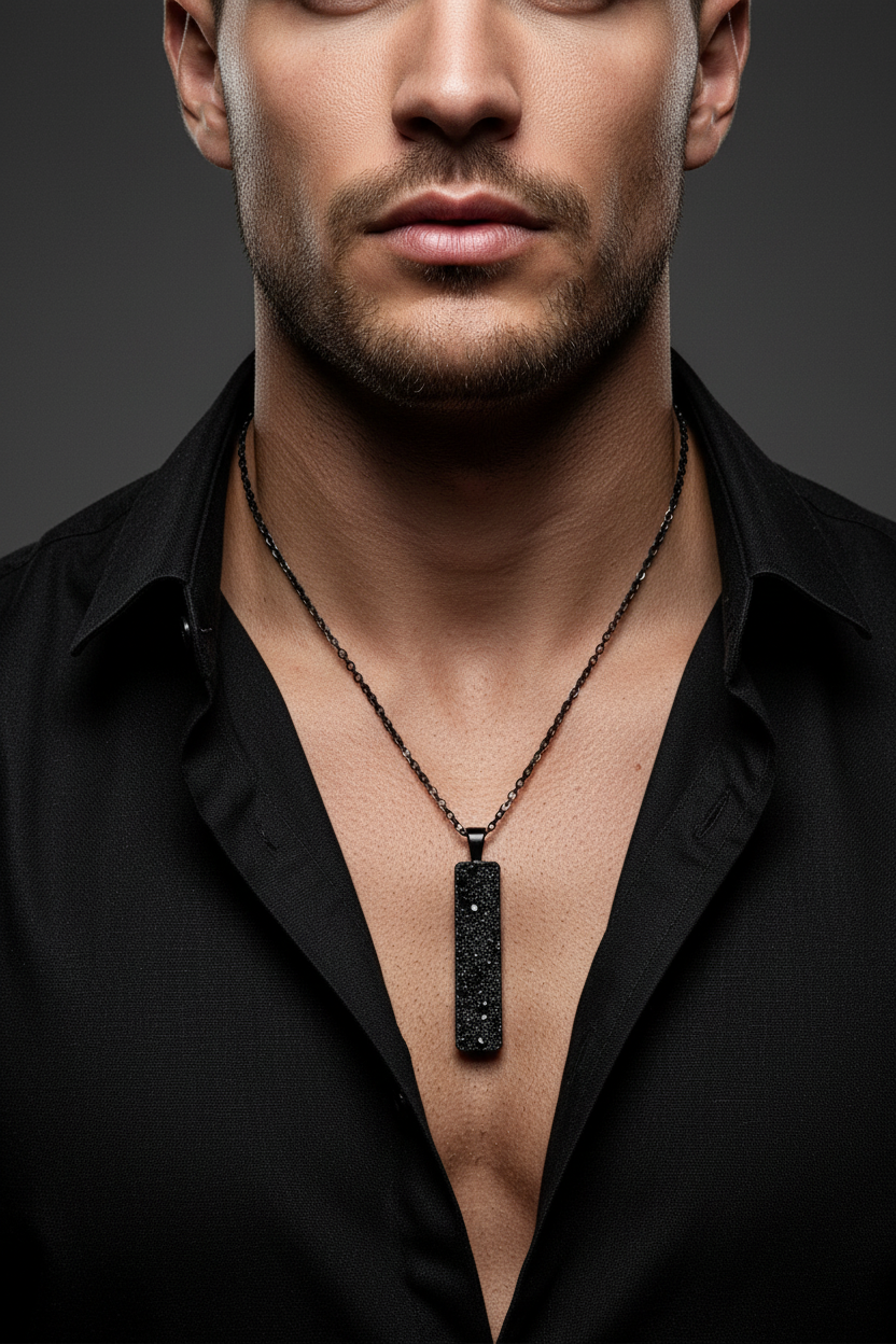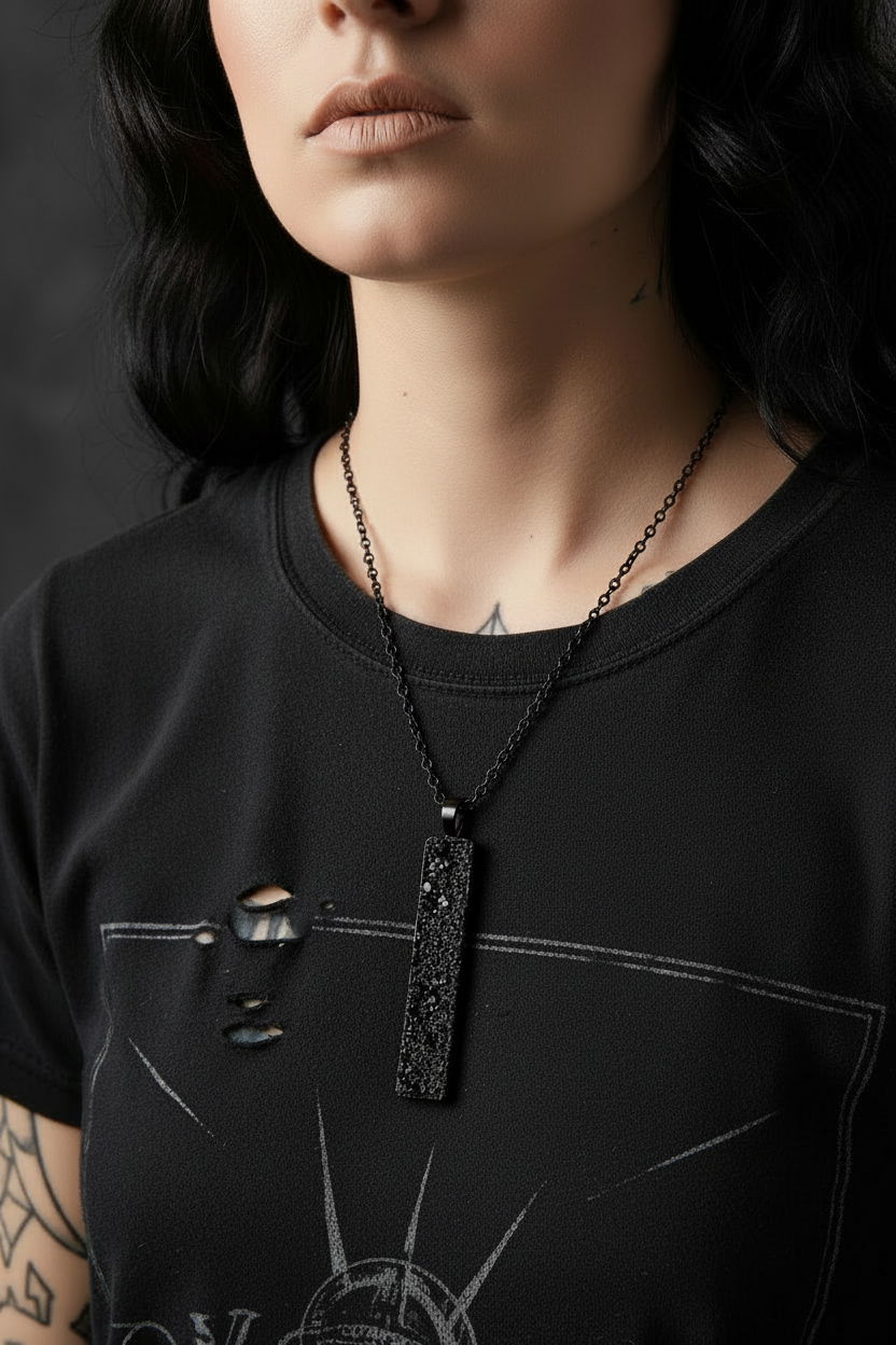 Verižica Stik je preprosto črna, športno elegantna. Primerna za moške in ženske. Dolžina črne verižice je 50 cm, z dodanim podaljšanjem. Dolžina obeska je 5 cm.